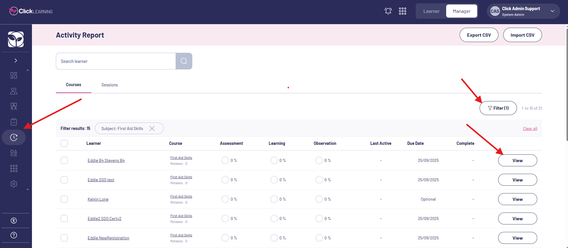 - Go to the Activity Report and set the filters to show the courses you want to update