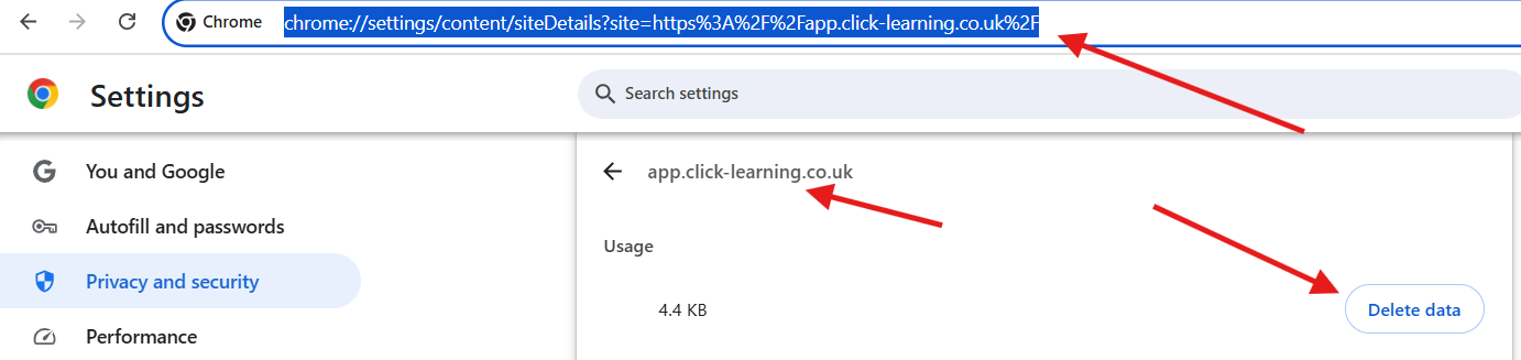 It is important to only clear for click-learning.co.uk only as we don't want to lose cached data for other sites you may be using.