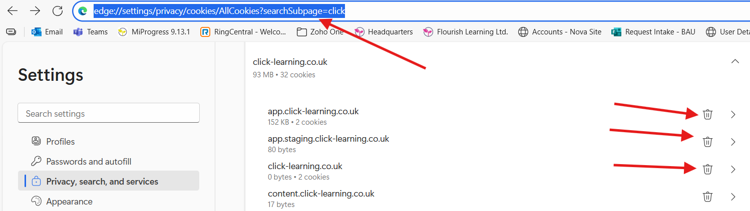 Open Edge and paste this into the bar edge://settings/siteData?searchSubpage=app.click-learning.co.uk