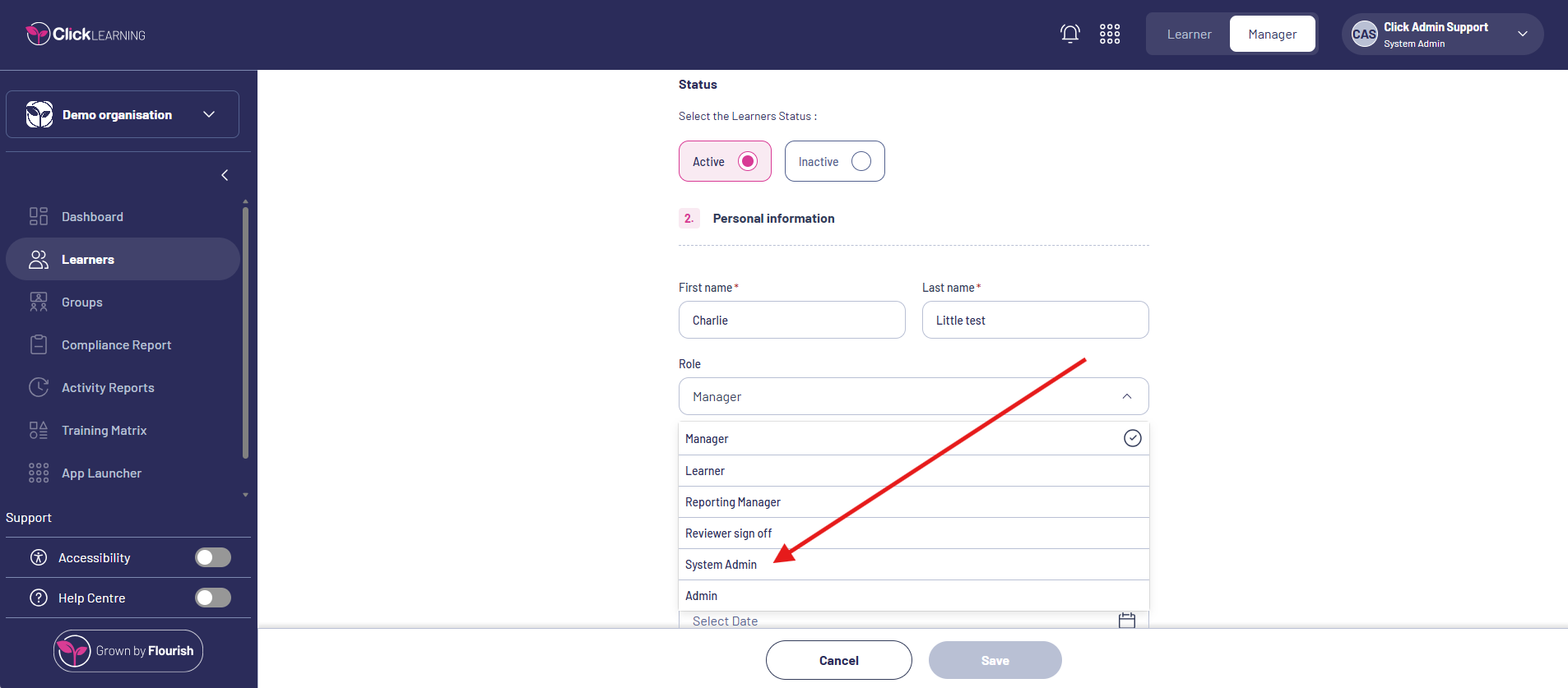 This article explains who can request System Admin access for Click Learning and how to assign the role to others.