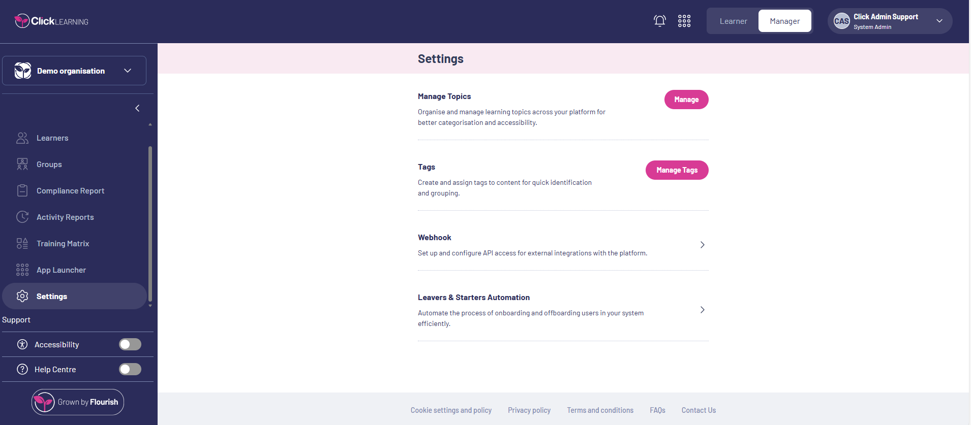 This article explains what the fourth option in the Settings menu does and how it can help connect Click Learning with your HR system.